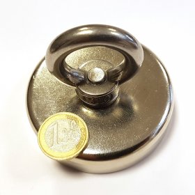 muni d'un œillet permettant de fixer fermement une corde ce modèle d'aimant est tout particulièrement adapté à la prospection dans les puits, lacs et rivières.